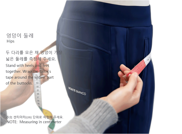 Measure around the widest part of the buttocks while standing with heels and feet together (see photo).